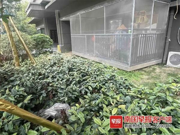 ▲排污管道已经修复,但仍有明显臭味,小区绿化损毁严重。南国早报见习记者 易治平摄